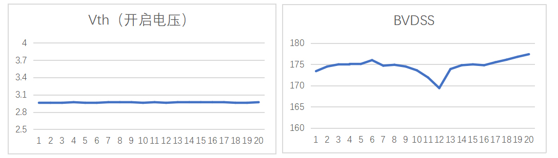 2、MOS耐壓設(shè)計余量不足,為了追求極致內(nèi)阻,BVDSS余量偏低。通過上述數(shù)據(jù)可以看出,APM通過優(yōu)化工藝,可以有效實現(xiàn)將開啟電壓一致性控制在0.2V一個檔位,滿足客戶超過6管的應(yīng)用電路,最高可以滿足10個一組合計6組并聯(lián)使用。